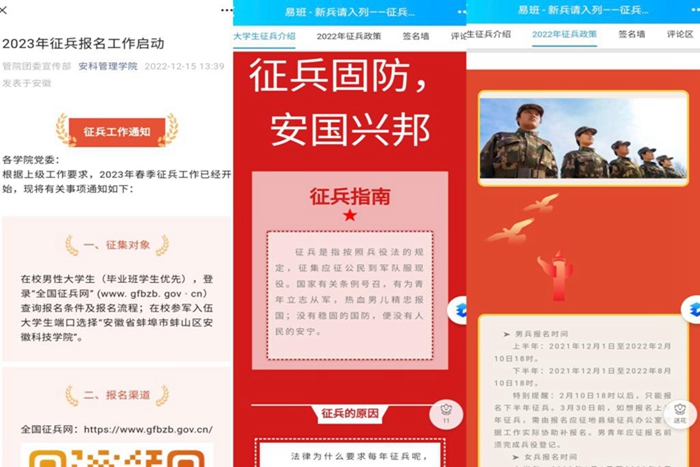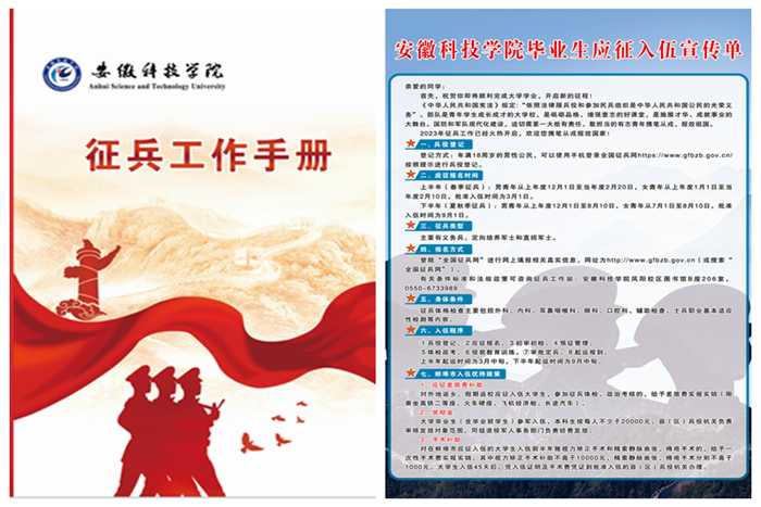 立体化宣传强化新希望。编印发放500多册MK官方网站_MK(中国)股份有限公司,征兵工作手册,涵盖法规、政策和征兵工作指南,成为领导干部和一线工作人员征兵的有力帮手。制作发放3500余份“致安科2023届毕业生的一封信”宣传彩页,做到应届毕业生人人知晓应征程序、优待政策和咨询电话。各学院利用主题班会、征兵工作动员大会、辅导员专题会议、谈心谈话等形式,利用班级qq工作群、易班专栏、微信公众号、网站等多媒体矩阵发布征兵动态、传播政策信息,营造立体化、全方位、多层次的宣传新格局,助推征兵工作掀起新高潮。