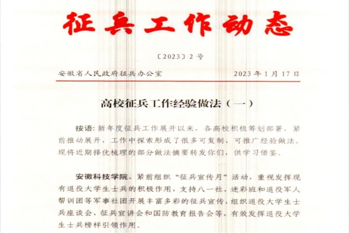 2023年春季征兵启动以来,我校认真组织开展相关工作。安徽省人民政府征兵办公室主办的《征兵工作动态》第1期充分肯定新年度各高校开展的征兵工作,择优刊发了22个高校征兵工作典型经验做法。我校扎实开展征兵宣传动员工作,相关经验做法成功入选。