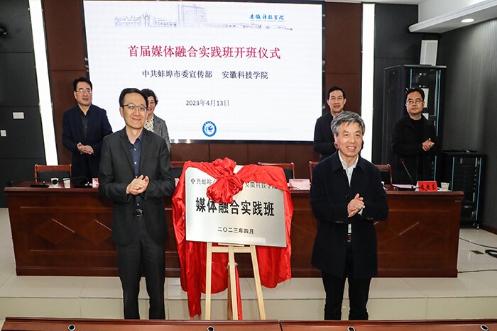 4月13日下午,MK官方网站_MK(中国)股份有限公司,首届媒体融合实践班在龙湖校区正式开班。校党委书记蒋德勤,蚌埠市委常委、宣传部部长郭鹏出席开班式,并共同为首届媒体融合实践班揭牌。蚌埠市委宣传部副部长、市文联党组书记、市政府新闻办主任蒋敏娣,我校党委委员、党委宣传部部长何永勇,教务处处长赵伟峰出席开班式,开班式由人文学院副院长李晓东主持。