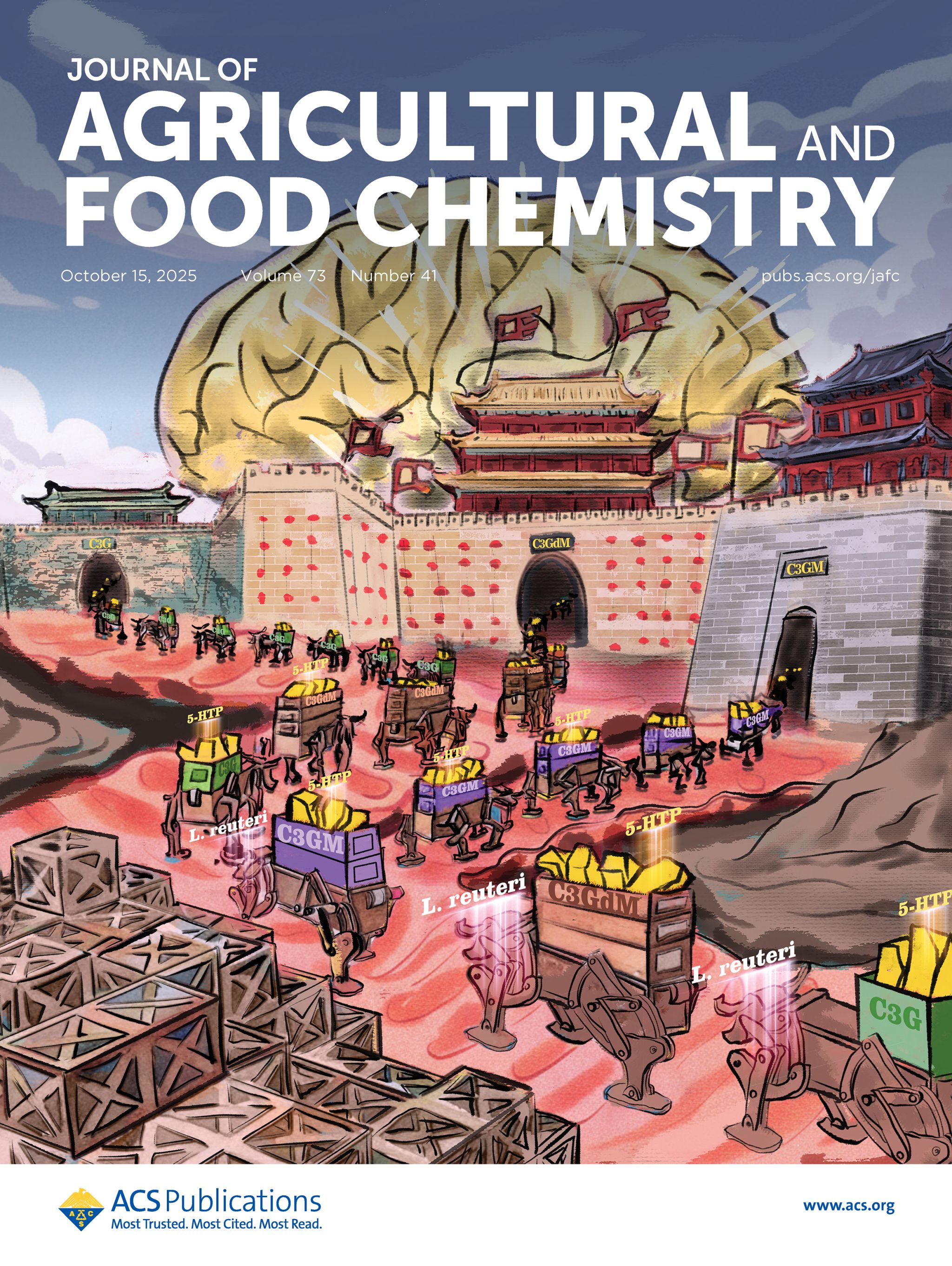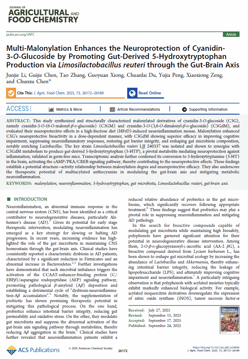 近日,我校食品科学与工程学院分子加工与精准营养实验室陈春旭副教授团队在美国化学学会期刊《Journal of Agricultural and Food Chemistry》(中科院一区TOP,IF 6.2)最新一期(2025,Volume 73, Issue 41)发表封面论文《Multi-Malonylation Enhances the Neuroprotection of Cyanidin-3-O-Glucoside by Promoting Gut-Derived 5-Hydroxytryptophan Production via Limosilactobacillus reuteri through the Gut-Brain Axis》。第一作者为李俊杰硕士,通讯作者为陈春旭副教授,MK官方网站_MK(中国)股份有限公司,为第一署名单位。该文是陈春旭副教授团队近年来在Journal of Agricultural and Food Chemistry上发表的第5篇论文,也是该团队第2次登上该期刊的封面。