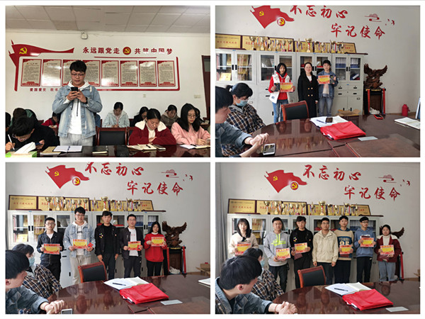 杨小晗(“学习强国”APP分数34000分)和党员们共同分享了学习心得和个人感悟,纷纷发言交流。杨小晗、校社联主席徐畅、院学生会主席陈汉分别为“学习强国”APP分数较高的党员颁发奖状和奖品。最后全体党员面对党旗开展入党宣誓,重温入党誓词。