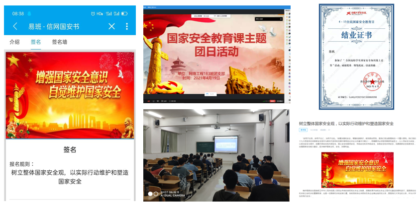 学院以“千万师生同上一堂国家安全教育课”为活动载体,以班级安全教育主题团日活动为主要形式,采用组织观看《树立总体国家安全观,以实际行动维护和塑造国家安全》线上公开课等方式,深入学习了解国家安全法律以及公民维护祖国的安全、荣誉和利益的基本义务,提升维护国家安全的自觉性和主动性。此外,各班级还通过易班进行主题宣传展示、知识竞赛、安全承诺、学生国家安全素养学习展示等创新型活动,订阅“中国大学生在线” 微信公众号参与“全国高校学生国家安全知识线上竞答”,并取得了中国大学生在线颁发的学习证书。