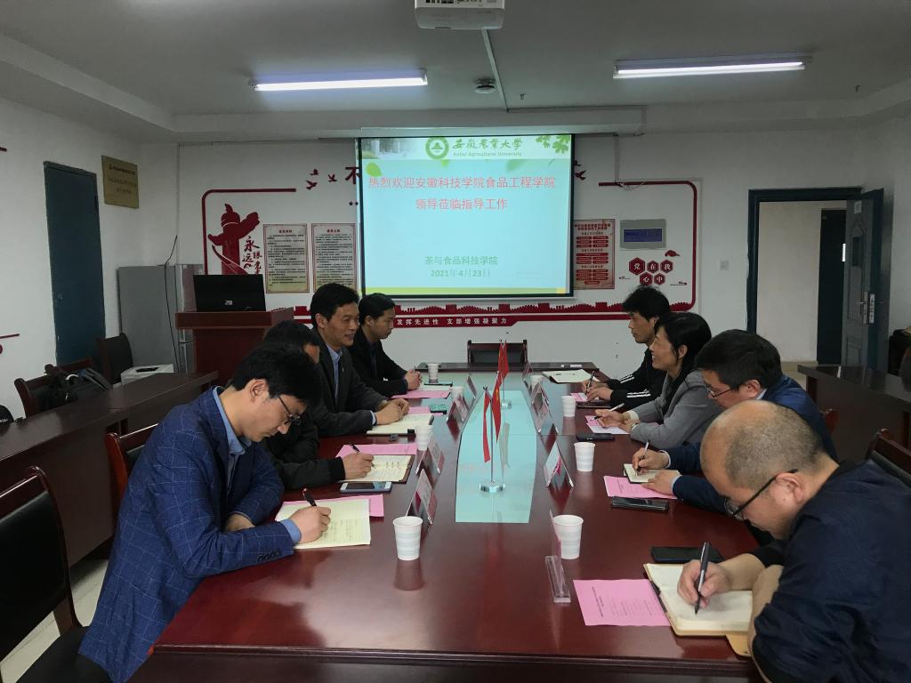 4月23日上午,付光玺一行到安徽农业大学茶与食品科技学院学习考察党建双创工作,该院党委书记唐红萍、食品教工第一党支部书记熊国远教授、党政办主任张宪林、组织员张奎参加座谈。唐红萍围绕“五个到位”和“七个有力”,全方位介绍了茶与食品学院党委党建尤其是党建双创工作的好做法。双方就如何发挥学院党委在学院发展中的政治核心作用,突出围绕中心抓党建这个主线等一系列问题开展了深入交流。