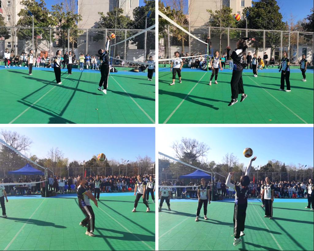 比赛开始那一刻,排球队员们瞬间激情高涨,两脚开立,膝盖微弯,身体前倾,手臂绷直,气势十足!就在一刹那,球员们抓住了防守的漏洞,瞄准时机,“传”“垫”“扣”,配合得天衣无缝,杀对方措手不防,各队主力毫无保留地拿出了自己的绝技。队员们也顾不得自己早已肿胀的胳臂,注意力只放在排球上。此时,大家眼中只有“认真发挥,不留遗憾”。排球运动员们在赛场上充分发扬顽强拼搏、众志成城、坚持到底、永不言败的体育精神。他们在赛场上为救球竭尽全力、甚至冲出场外。面对失利,也毫不气馁、相互鼓励,为每一个好球击节叫好、相互拥抱。场外同学们“加油、加油”的呐喊声此起彼伏,响彻整个校园。
