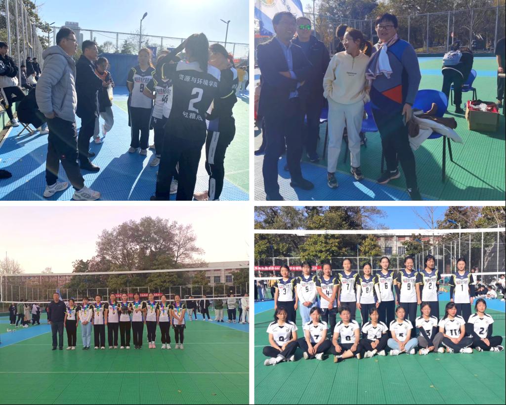 11月24日下午,资源与环境学院与建筑学院的女排决赛在玉园排球场热烈开赛。党委副书记沈树周、党政办主任吴国良、团委副书记杨小晗莅临现场为运动员们加油助威。