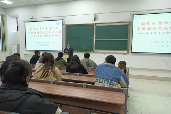 为进一步提升广大学生干部的综合素质及能力,11月27日上午,党委学工部、学生处秘书石志成应邀在龙湖校区为财经学院学生干部作了“勤学习、勇担当、善作为,争做新时代优秀学生干部”的主题讲座。讲座由财经学院专职辅导员朱中军主持。