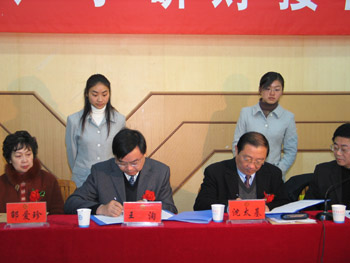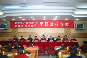 合作仪式由市政府秘书长陈桂林主持,王洵和沈太基分别致辞。王洵在讲话中充分肯定此项产学研合作的重要意义,他代表蚌埠市政府表示今后将一以贯之地支持产学研合作;沈太基代表我校向出席本次合作仪式的各位领导、专家、嘉宾表示热烈地欢迎,感谢蚌埠市政府多年来对我校办学的关心支持,并表示将进一步加大力度,转化科研成果,服务于社会主义新农村建设。安徽莱姆佳肥业有限责任公司张经理和我校时维静教授代表企业和项目专家就产学研合作分别发言。