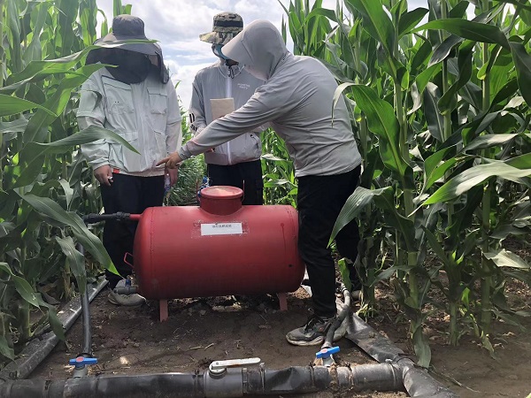 在师兄师姐的指导和帮助下,实践团迅速投入到玉米科研实践中去, 白天对玉米叶片进行标记,观察记录羽毛吐丝、抽雄情况 ,对玉米地进行滴灌冲肥。晚上学习文献资料,与师兄师姐讨论交流实践心得,每天的实践活动都非常充实。