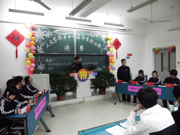 11月19日晚,人文学院首届新生辩论赛决赛在新知楼B101举行。人文学院公共管理系姚庆、高峰老师、辅导员黄钦海老师、植物科学院学生会主席王威威、人文学院学生会主席王耀华应邀出席并担任评委。比赛由徐俊杰主持。