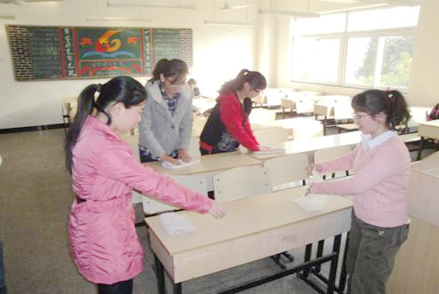 11月10日下午三点,东区女生公寓党员工作站全体党员自备工具于东区女生公寓门口集合,在站长任凤娇的带领下分为六组对求知楼B座教室进行了“清除课桌文化”活动。参加此次活动的党员们不怕脏,不怕累,干劲十足,争为母校60周年华诞贡献的一份力量、献上的一片爱心。她们作为学生党员,在喜迎校庆、绿化校园、美化环境的过程中,巾帼不让须眉,率先垂范,争作贡献,经过近二个小时的集中清理,求知楼B座五十多间教室内的课桌全部清理完毕。