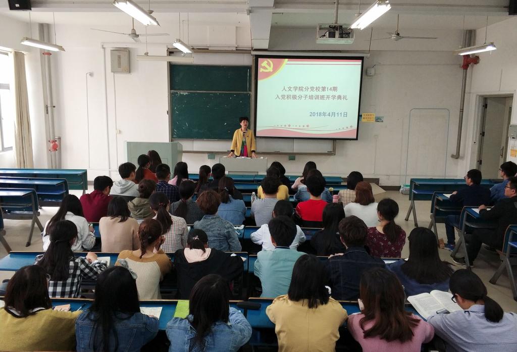 4月11日下午,人文学院分党校第14期入党积极分子培训班开学典礼在新知楼A108教室举行。人文学院党总支书记杜士凤,2017级新生辅导员曹珊珊出席典礼,全体入党积极分子参加典礼。开学典礼由曹珊珊主持。