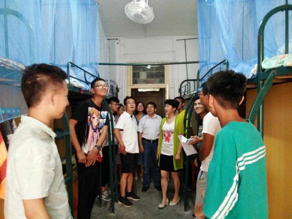 领导和老师们每到一个宿舍便亲切地与新同学们交谈,详细询问他们的家庭情况、入学感受、个人的兴趣爱好以及对新环境的适应情况,温馨地提醒大家要注意安全人身、财物安全,尽快适应大学生活,做好自己的计划,珍惜时间,充实快乐地展开新的大学生活。