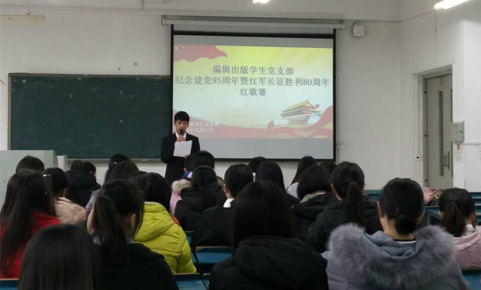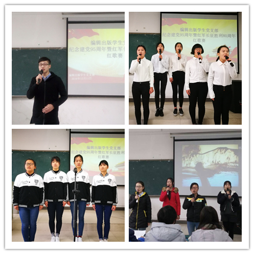 红色的经典吟唱难忘的岁月,熟悉的旋律演绎时代的乐章。12月11日上午,由编辑出版学生党支部主办的“庆祝建党95周年暨红军长征胜利80周年红歌赛”在新知楼103教室举办。担任本次红歌赛的评委有编辑出版学生党支部书记王伟,支部组织委员姜雨晴,支部宣传委员严海艳,以及学生党员付蕾、田月月。