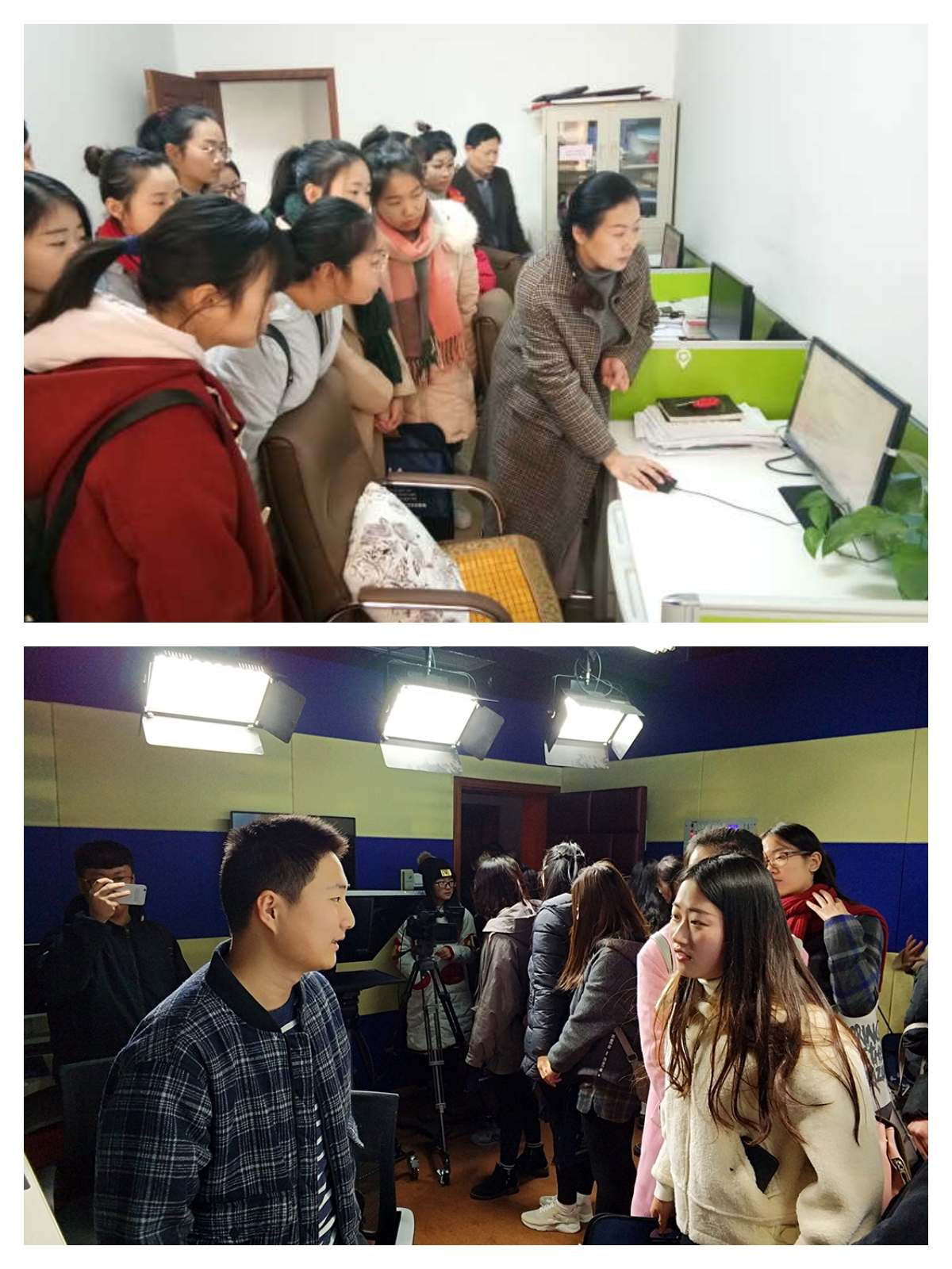 会后,全体学生分别参观了信息产业中心的报刊编辑部、新媒体编辑部和视频演播厅,与一线老师就课程学习和校内实践中遇到的问题进行细致的交流。