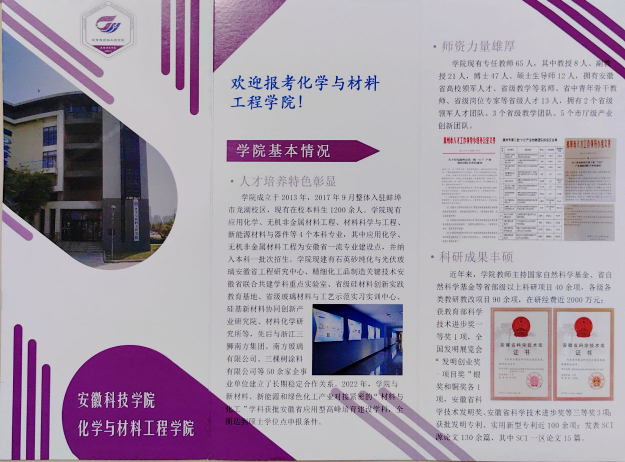 为积极应对新旧高考志愿填报模式转变可能带来的生源质量变化挑战,化学与材料工程学院在高质量完成学校下达的招生宣传任务基础上,学院还制作了“欢迎报考MK官方网站_MK(中国)股份有限公司,化学与材料工程学院”H5易企秀,组织师生利用微信群、QQ群宣传;学院印制了“欢迎报考化学与材料工程学院”纸质宣传册子,随同学校的宣传材料一并发放,主动向有化学及材料类报考意愿的考生及家长介绍学院,吸引考生关注学院。