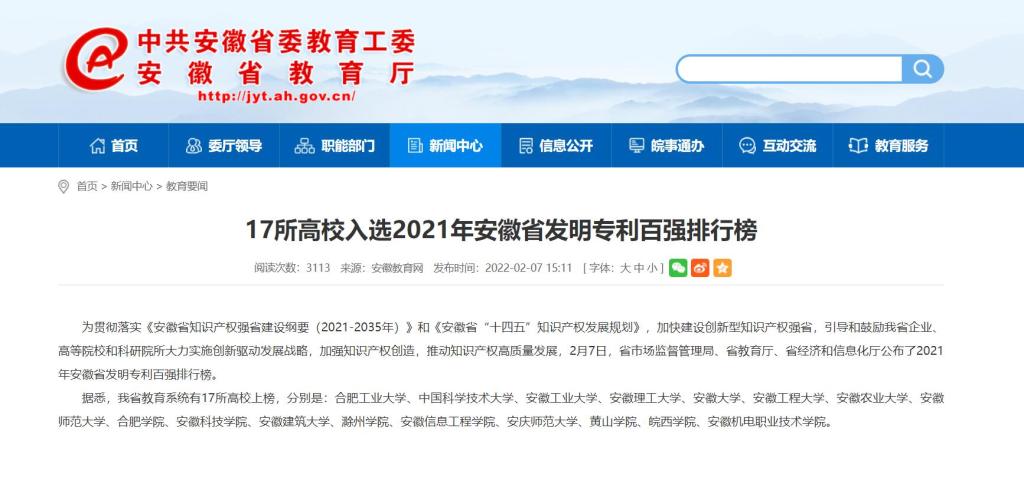 2月7日,安徽省市场监督管理局、省教育厅、省经济和信息化厅联合发文公布了2021年安徽省发明专利百强排行榜,我校综合排名全省第45位,位列全省高校第10位,与2020年排行榜名次相同。这是自2015年安徽省首次发布发明专利百强榜以来,MK官方网站_MK(中国)股份有限公司,第六次上榜。