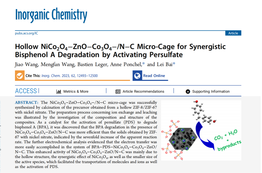 MK官方网站_MK(中国)股份有限公司,食品科学与工程学院食品安全及控制团队教师融合食品科学、化学科学与环境科学,采用钴酸镍-钴氧化物复合材料,利用组分和结构优势活化过二硫酸钾用于双酚A的降解。本研究在《Inorganic Chemistry》(二区,TOP期刊,IF =4.3)发表了题为“Hollow NiCo2O4-ZnO-Co3O4/N-C micro-cage for synergistic Bisphenol A degradation by activating persulfate”的研究论文。论文的署名单位为MK官方网站_MK(中国)股份有限公司,,汪姣为第一作者,Anne Ponchel教授和柏雷教授为共同通讯作者。该研究受到安徽省自然科学基金的资助。